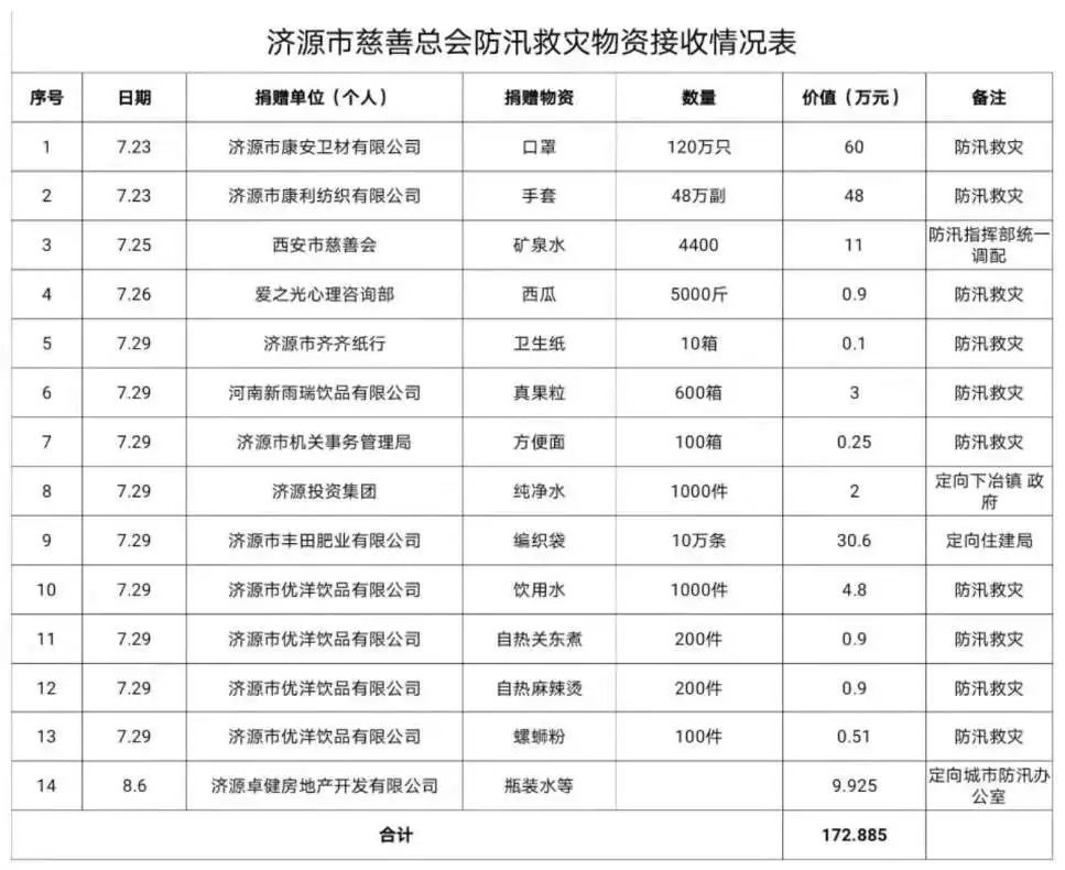 截至8月14日,济源市慈善总会共接收防汛救灾捐赠资金796.6万元、捐赠物资价值172.89万元;经示范区防汛抗旱指挥部、示范区民政局、市慈善总会会商向示范区党工委管委会主要领导汇报同意后,累计拨付资金747.59万元、拨付物资价值151.18万元(见附表)。