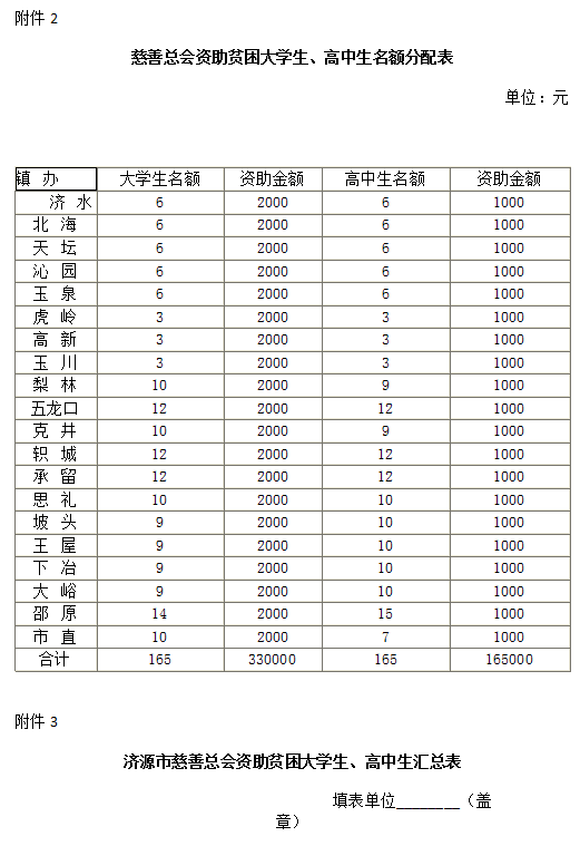 2、济源市慈善总会资助贫困大学生、高中生名额分配表。